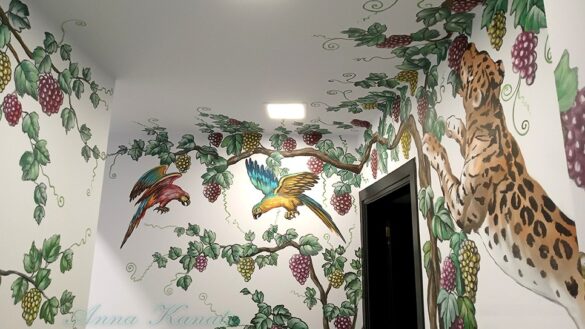 Στο μικρό, ανοιχτό στον χώρο υποδοχής κουζινάκι αυτού του ιατρείου, ζωγράρισα ένα θέμα με τρεις πάνθηρες που τρώνε σταφύλια από τις κληματαριές που απλώνουν τα κλαδιά τους σε όλους τους τοίχους.