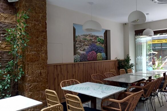 Σε πρώτο πλάνο βλέπουμε πέντε γλάστρες με πολύχρωμες άλλυσους, απ’ τις οποίες πήρε και το όνομα το εστιατόριο.