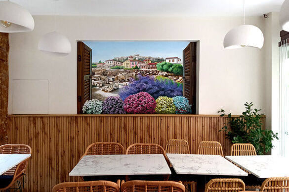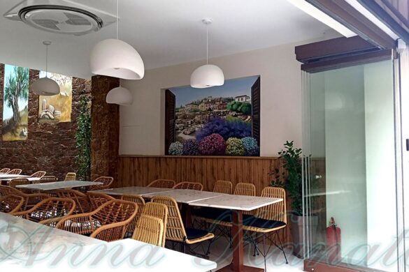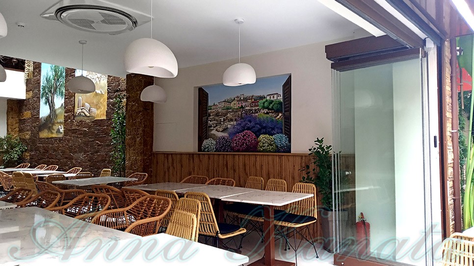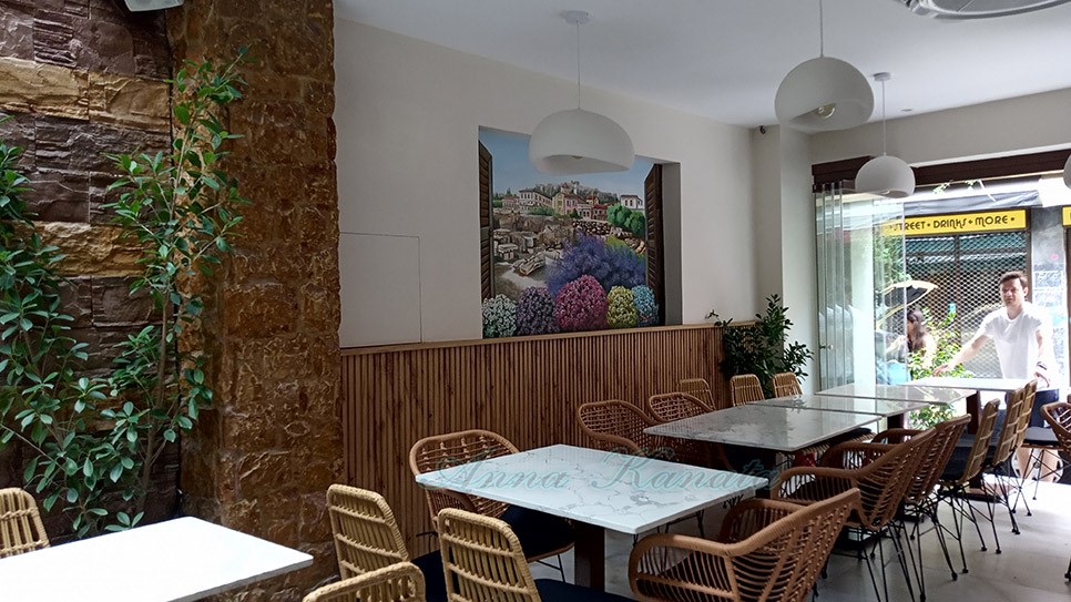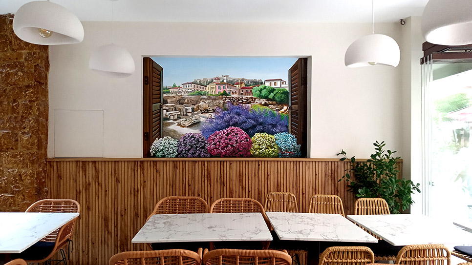 Στον τοίχο ενός πολύ όμορφου εστιατορίου που ετοιμάζεται ν’ανοίξει σε λίγε μέρες, ζωγράφισα ένα παράθυρο ανοιχτό, με θέα στην Πλάκα/Μοναστηράκι.