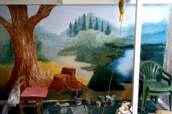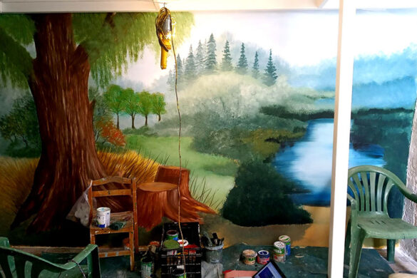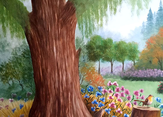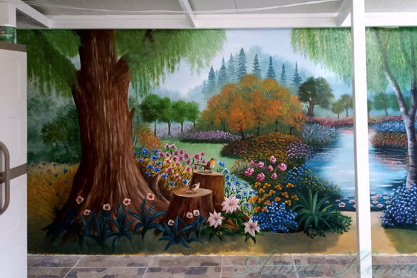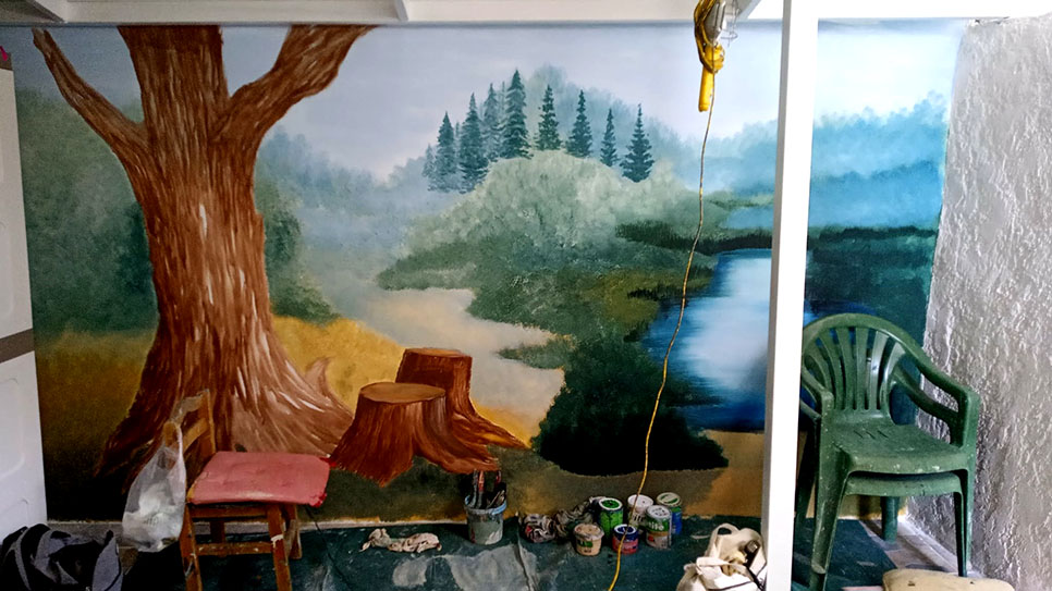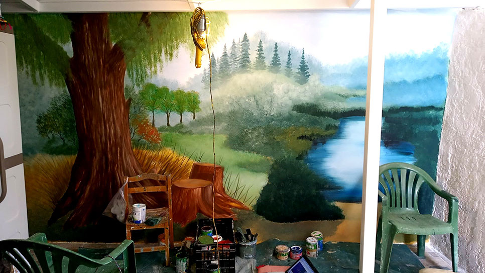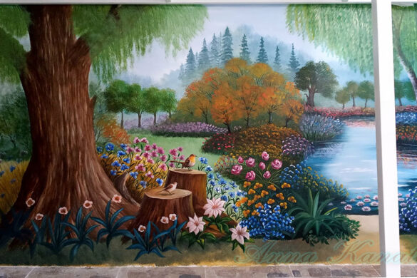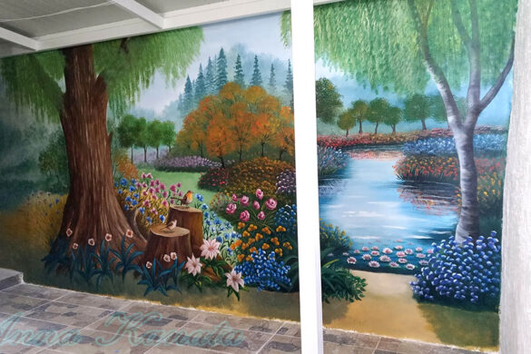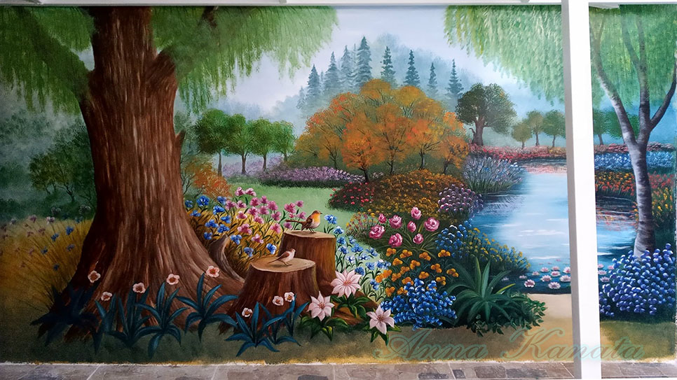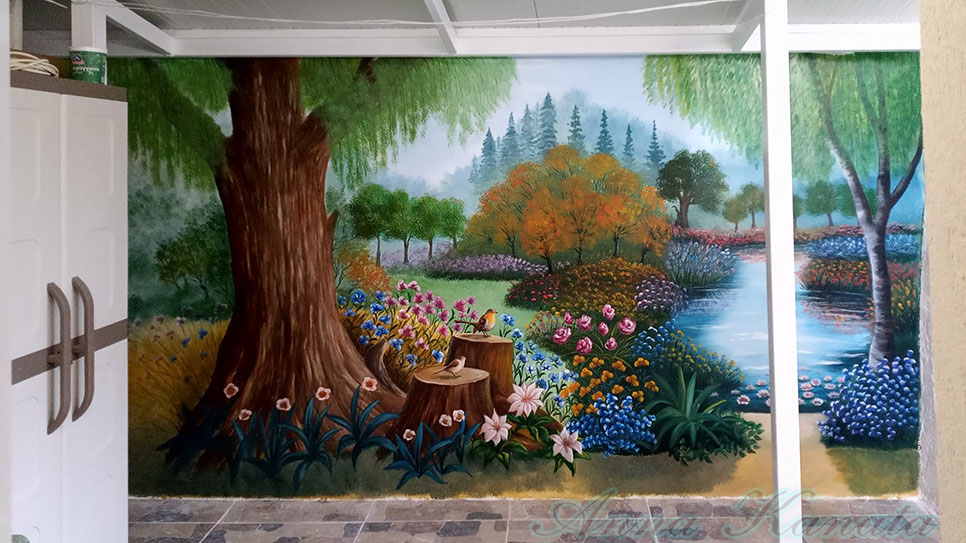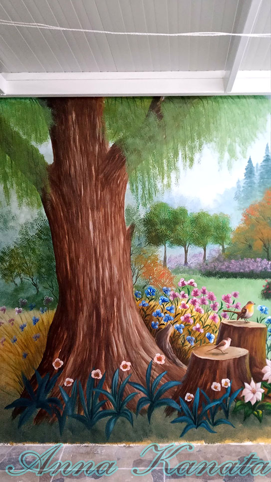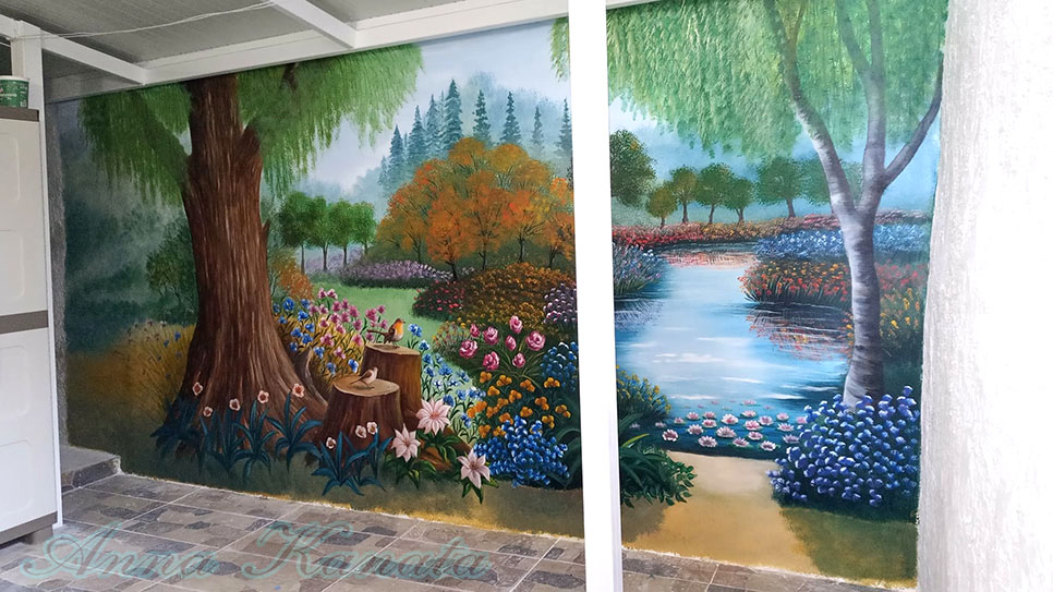 Στον τοίχο αυτής της μικρής σκεπαστής αυλής, μήκους 4,20μ, ζωγράφισα ένα δάσος με πολλά λουλούδια και μια μικρή λιμνούλα.