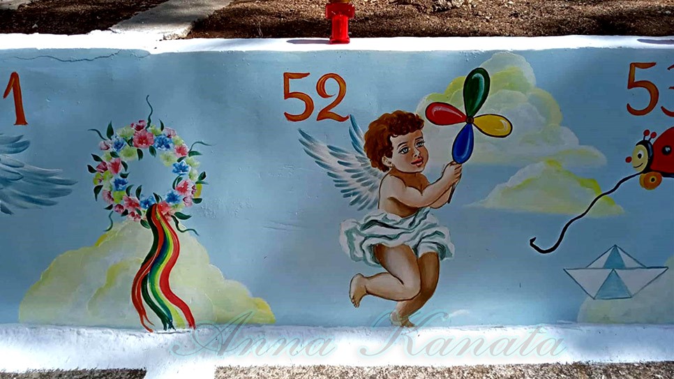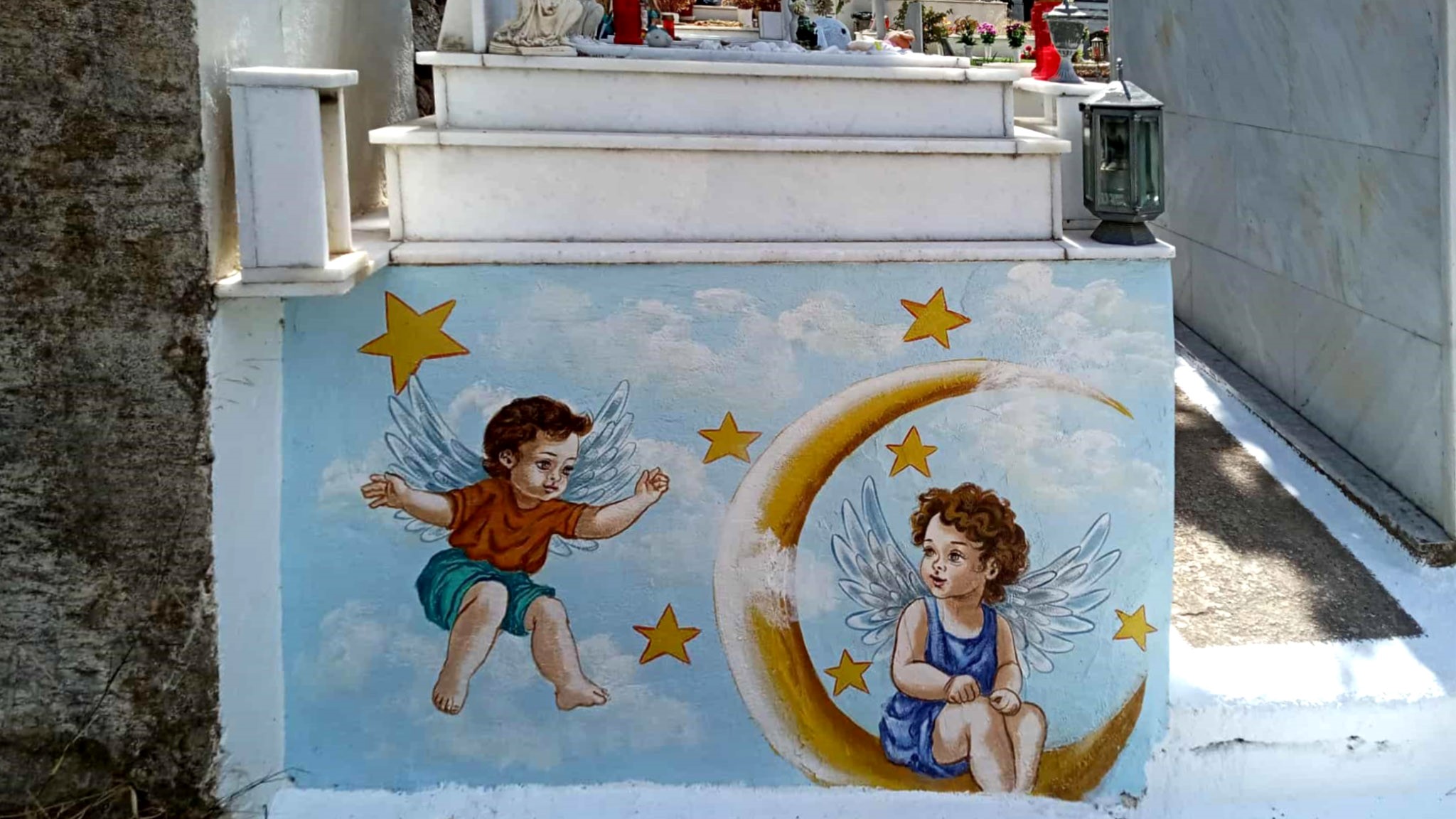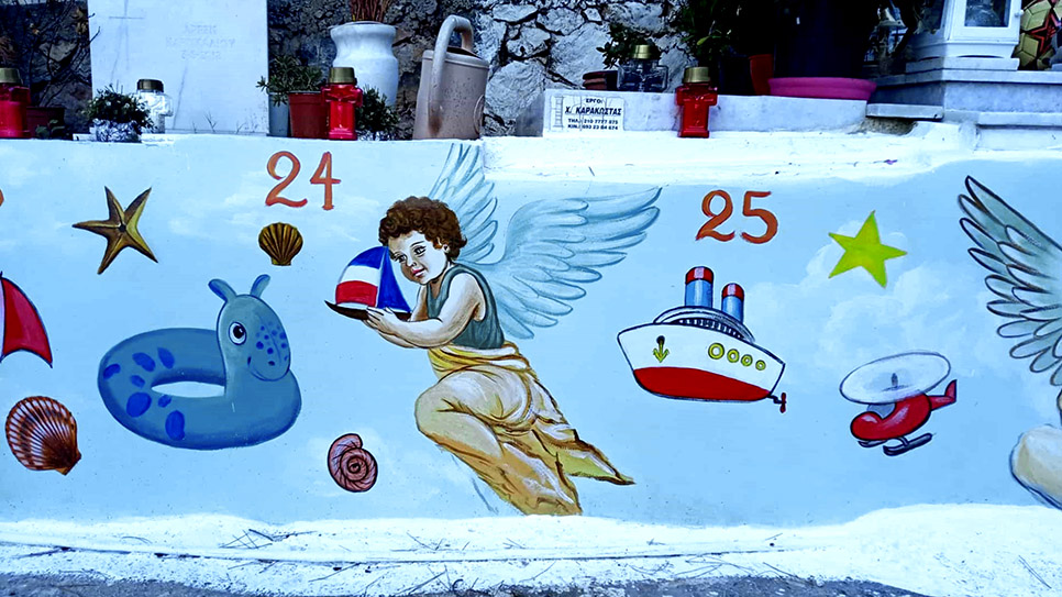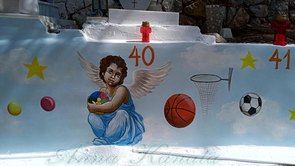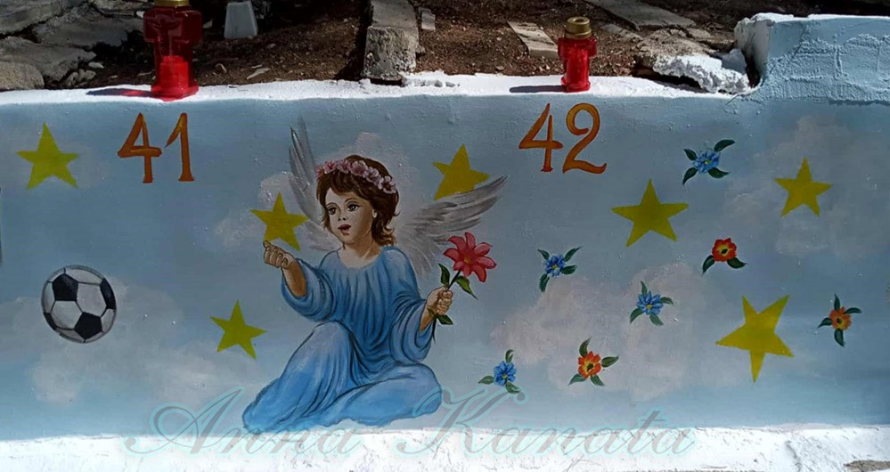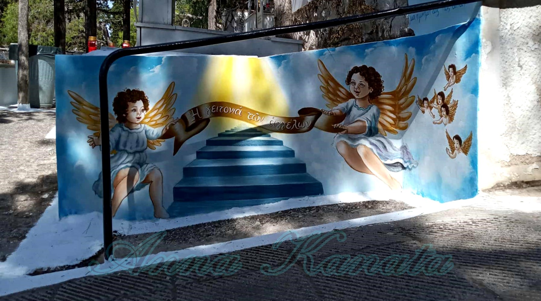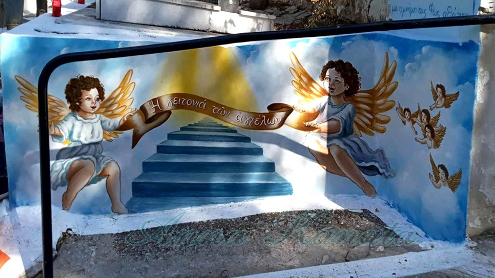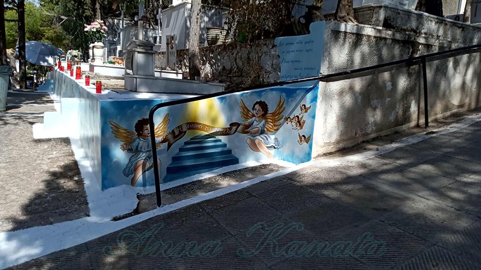 Στο παιδικό τμήμα του Κοιμητηρίου Ζωγράφου, μου ανατέθηκε από τους γονείς ενός μικρούλη 2 ετών, που έφυγε από τη ζωή, να ζωγραφίσω το τοιχίο μπροστά από τους παιδικούς τάφους.