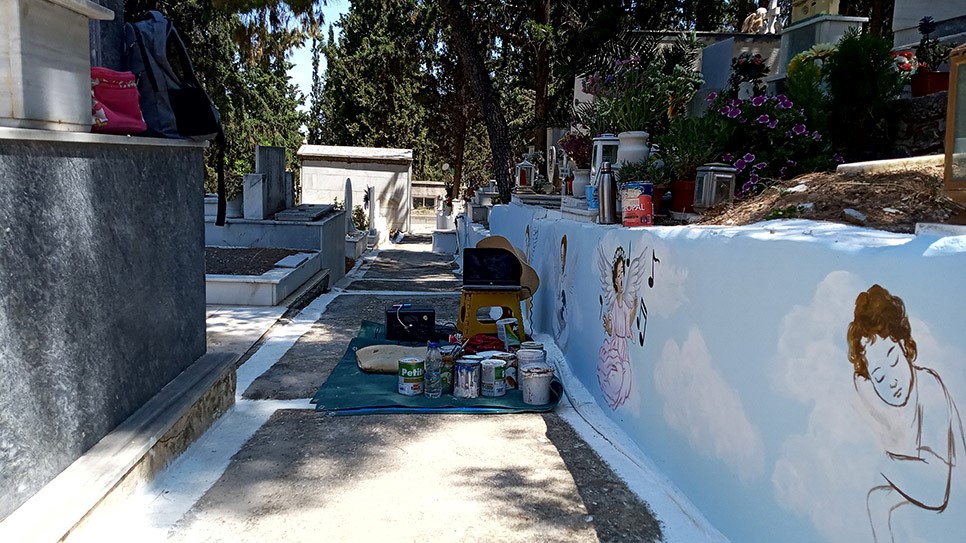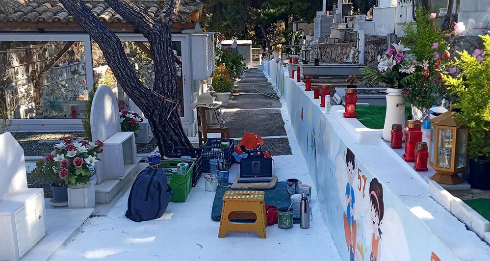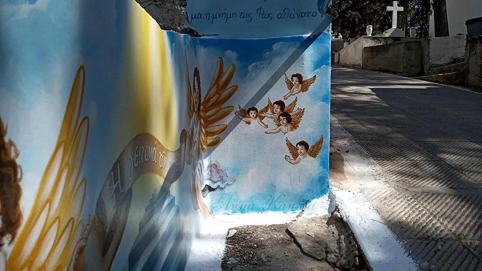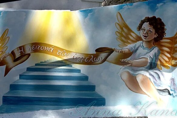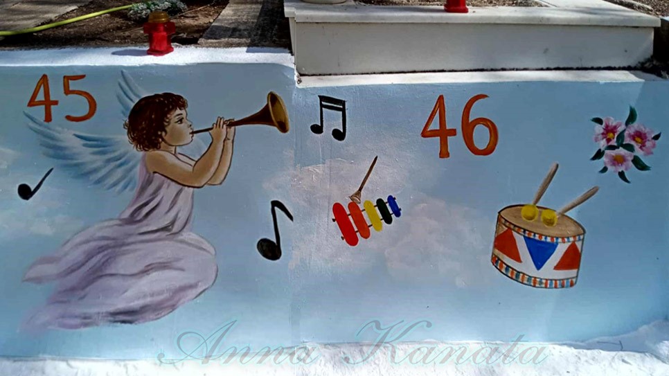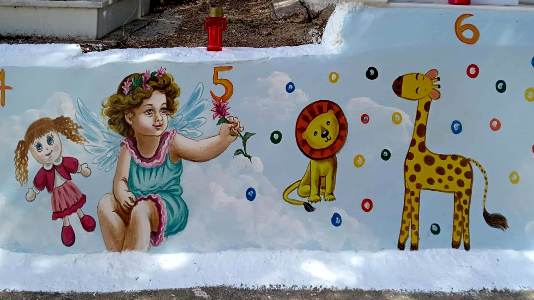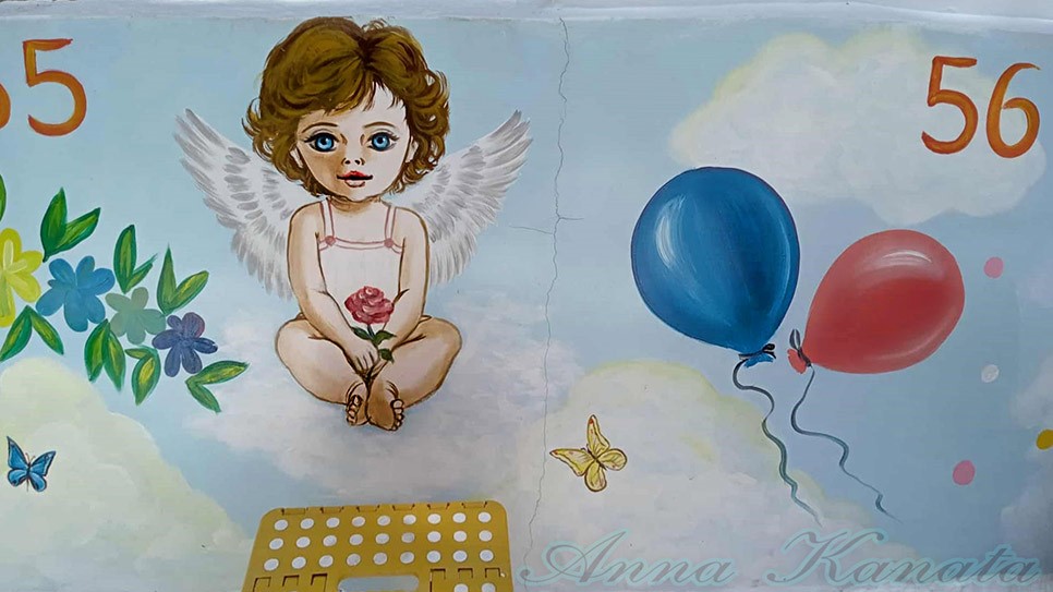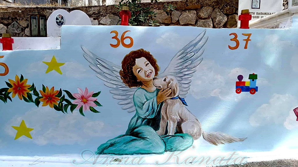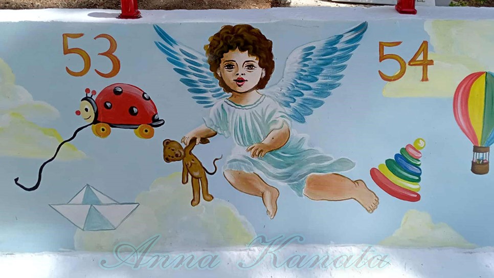 Στο παιδικό τμήμα του Κοιμητηρίου Ζωγράφου, μου ανατέθηκε από τους γονείς ενός μικρούλη 2 ετών, που έφυγε από τη ζωή, να ζωγραφίσω το τοιχίο μπροστά από τους παιδικούς τάφους.