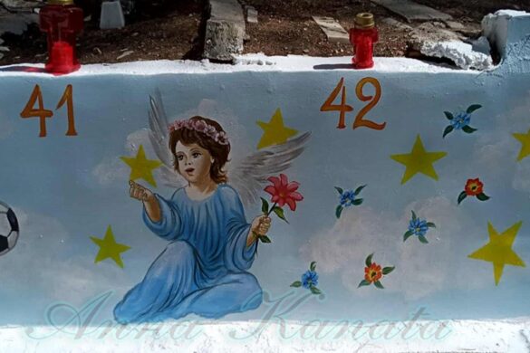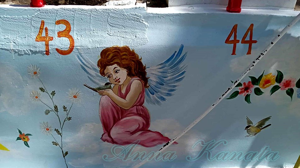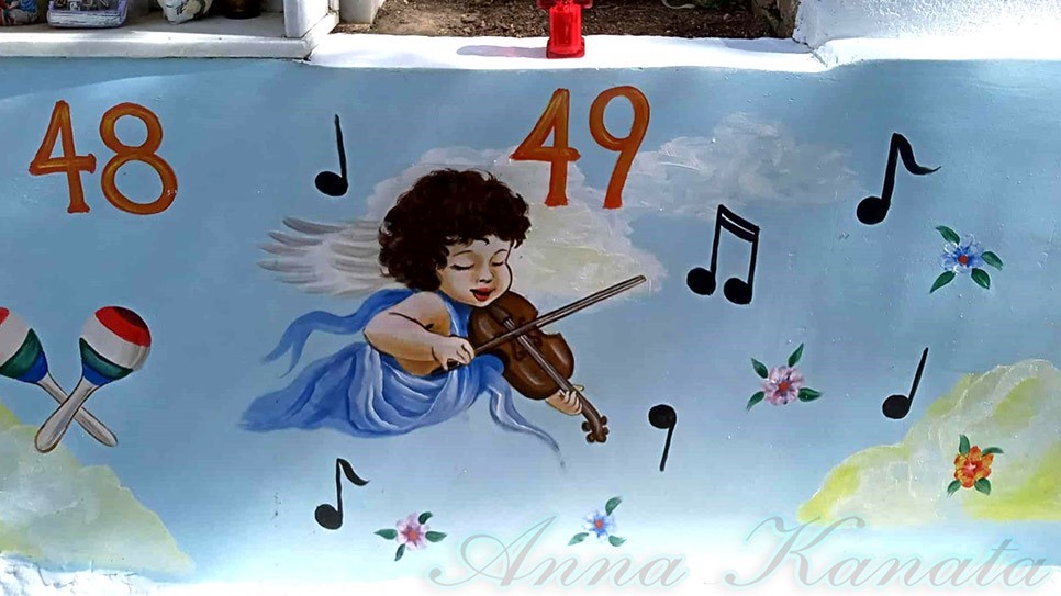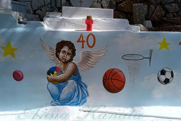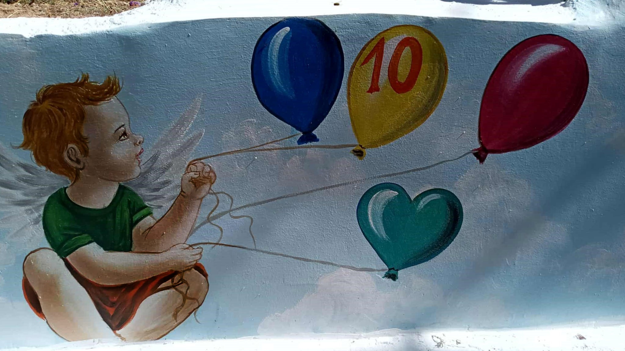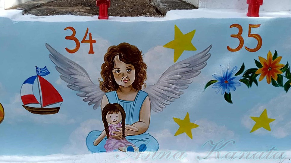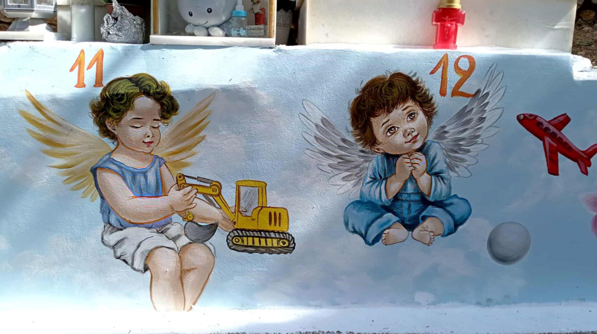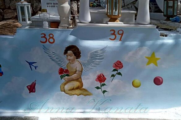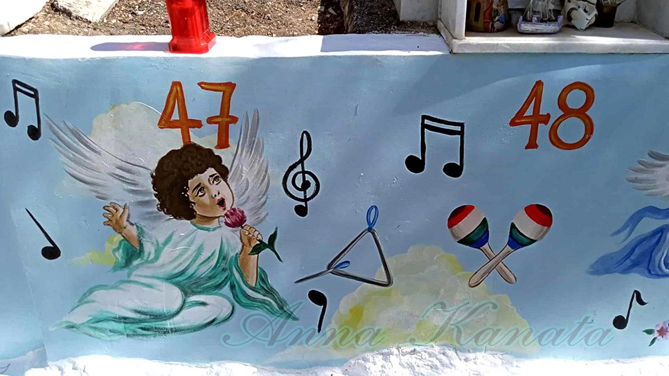 Στο παιδικό τμήμα του Κοιμητηρίου Ζωγράφου, μου ανατέθηκε από τους γονείς ενός μικρούλη 2 ετών, που έφυγε από τη ζωή, να ζωγραφίσω το τοιχίο μπροστά από τους παιδικούς τάφους.