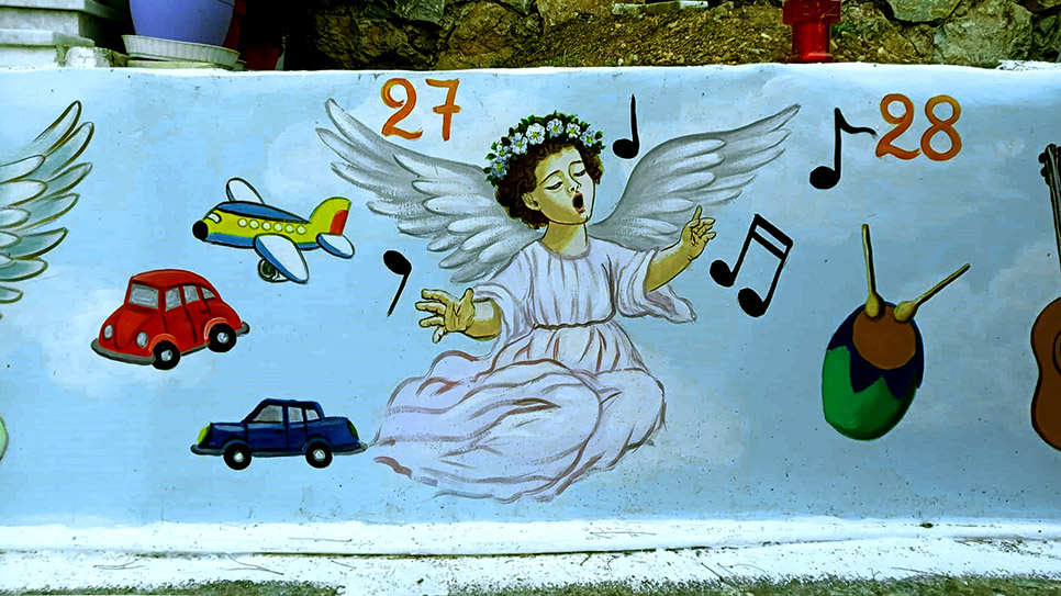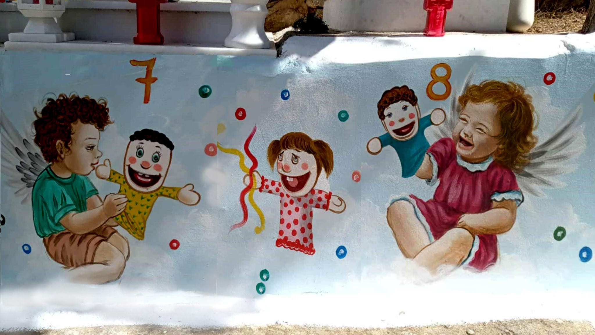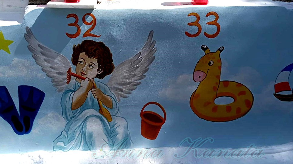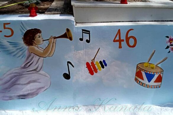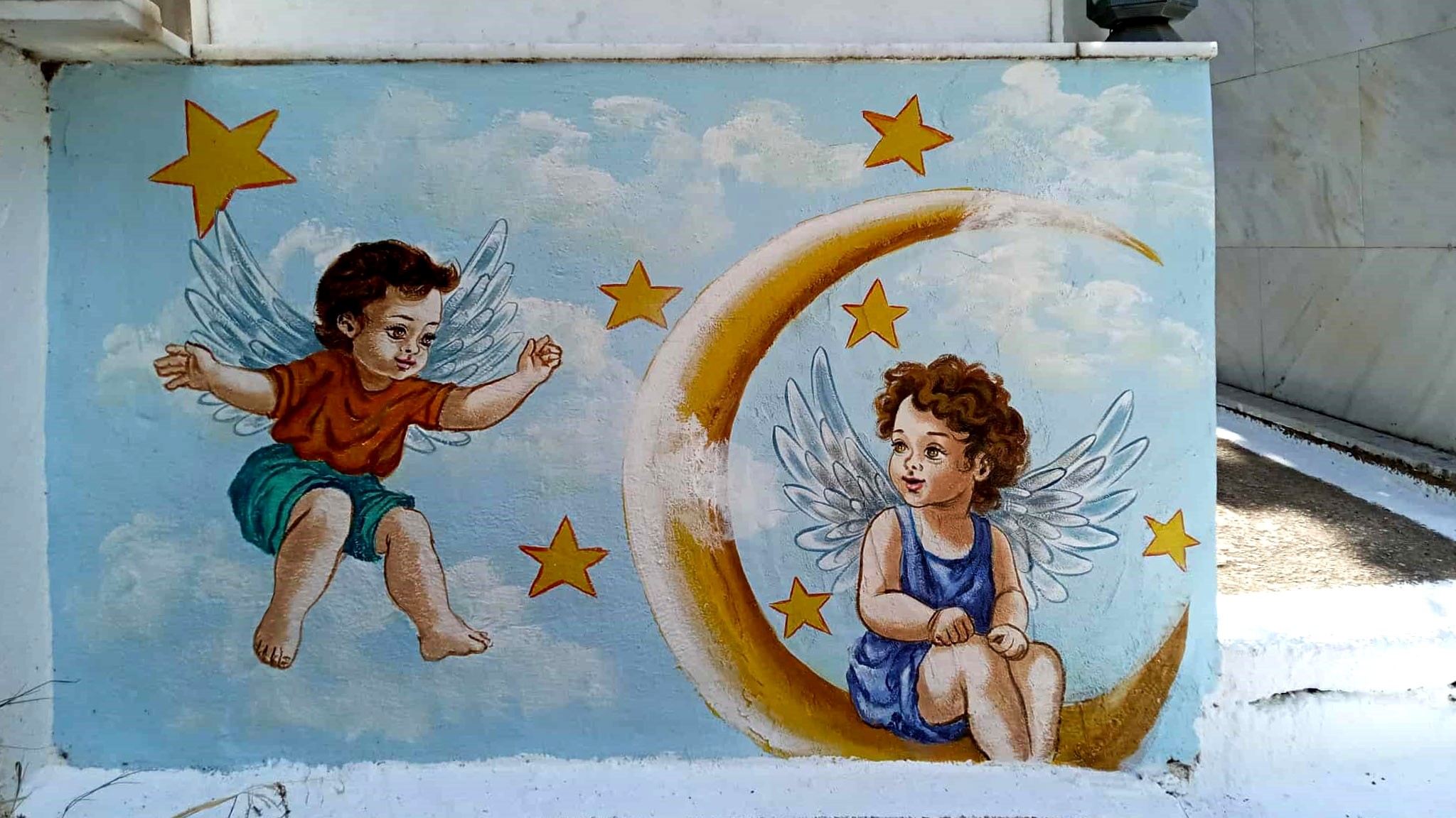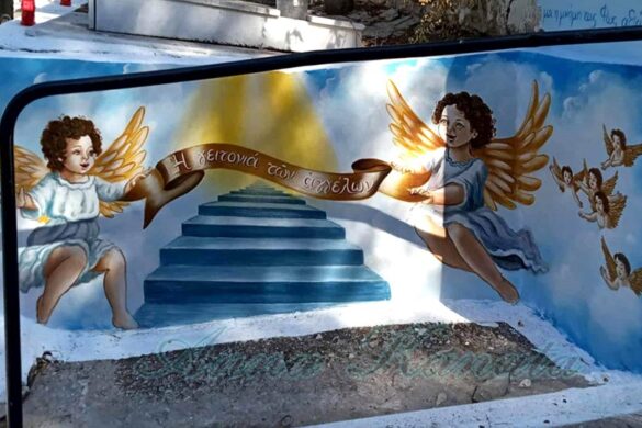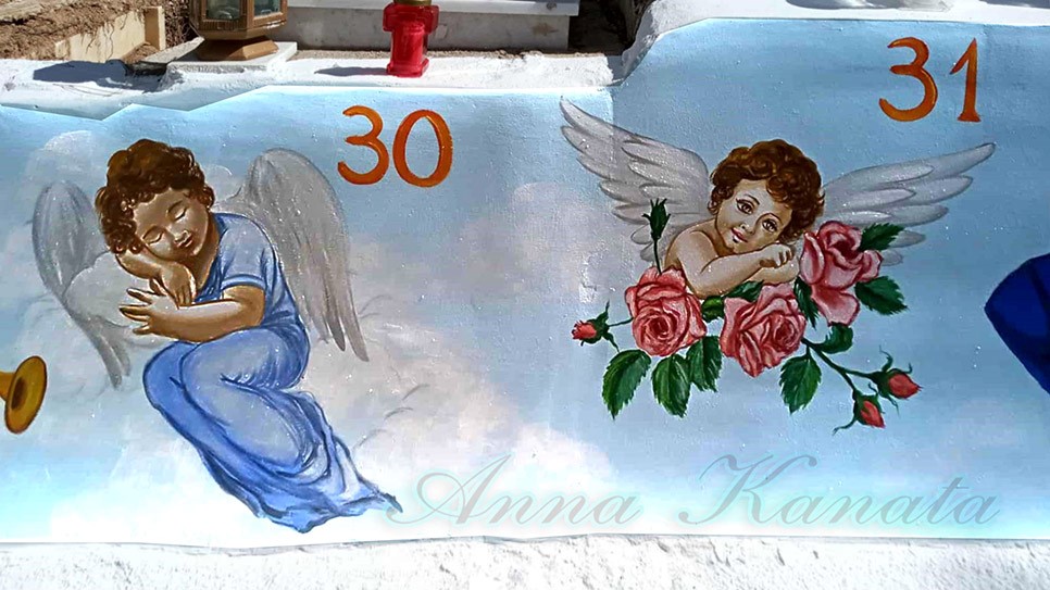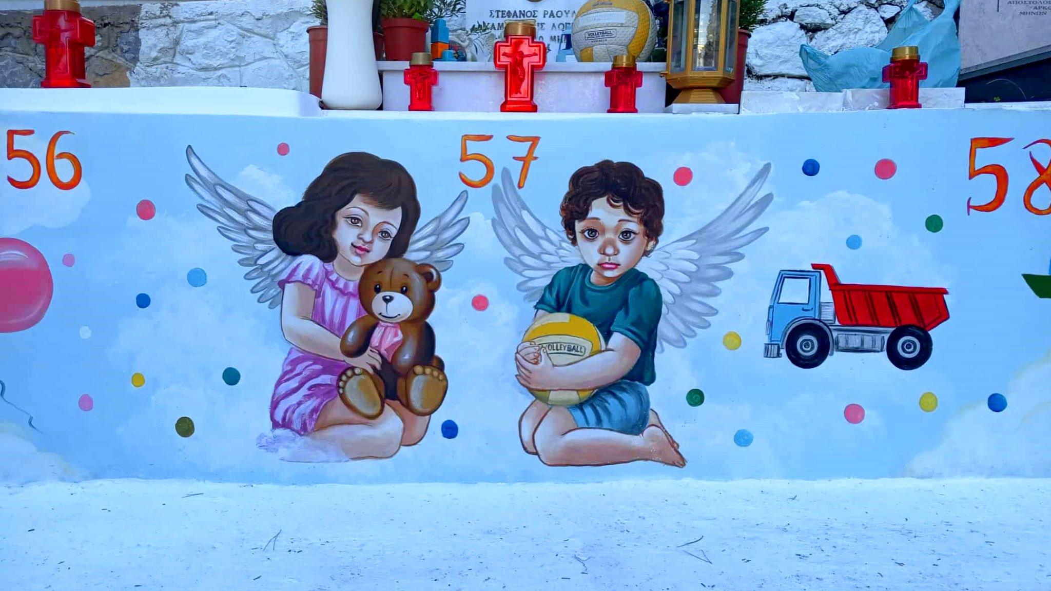 Στο παιδικό τμήμα του Κοιμητηρίου Ζωγράφου, μου ανατέθηκε από τους γονείς ενός μικρούλη 2 ετών, που έφυγε από τη ζωή, να ζωγραφίσω το τοιχίο μπροστά από τους παιδικούς τάφους.