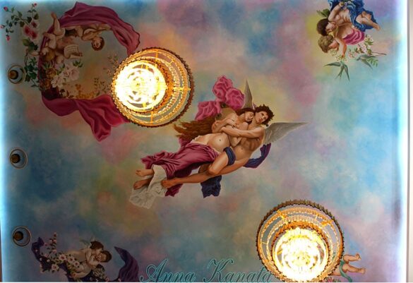 Στην οροφή του 2ου ορόφου αυτής της υπέροχης μονοκατοικίας, ζωγράφισα μια σύνθεση με κεντρικό θέμα το μυθολογικό ζευγάρι Ψυχή και Έρωτα, έτσι όπως το απέδωσε ο Γάλλος ζωγράφος William-Adolphe Bouguereau το 1901.