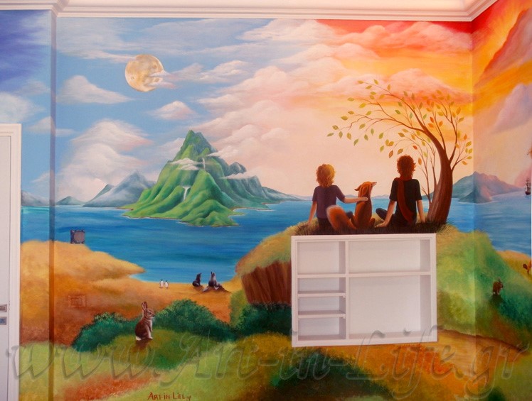 Στον πλαϊνό μεγάλο τοίχο, η ζωγραφική συνεχίζεται με άλλο θέμα, με τα ίδια τα αδέρφια και τον Πήτερ Παν που τους καλεί να
