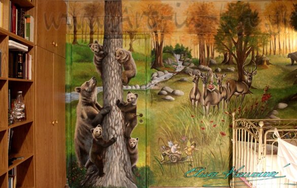 Στο μεγάλο δωμάτιο της 2 χρονών Καλλιρόης και του αδελφούλη της που θα γεννηθεί τον Γενάρη, δημιούργησα στους δύο μεγάλους ελεύθερους τοίχους, ένα σκηνικό από το μαγικό δάσος με ελάφια και αρκουδο-οικογένειες, που μαζεύονται όλα για την μεγάλη γιορτή των ξωτικών!