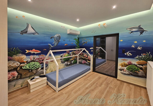 Ένα όμορφος βυθός με κοράλλια, δελφίνια και άλλα αγαπημένα πλάσματα της θάλασσας, ζωγράφισα σε δύο τοίχους του παιδικού δωματίου για τον 10 μηνών μπέμπη και τον αδερφούλη του που θα γεννηθεί σε δύο μήνες!